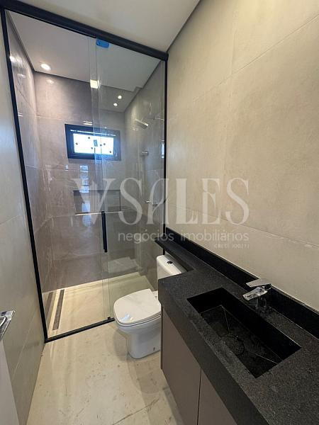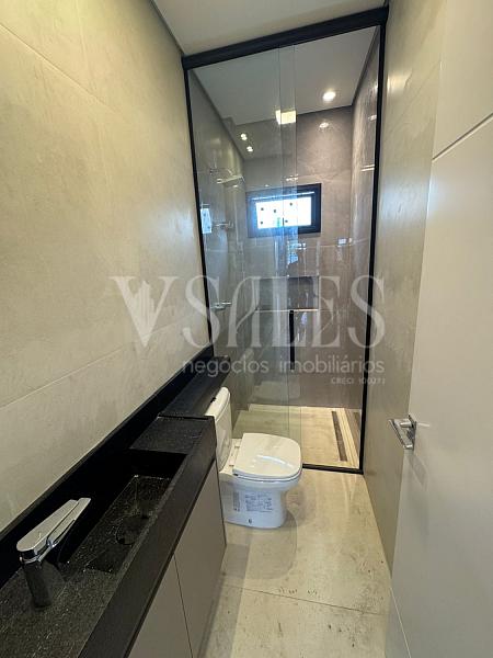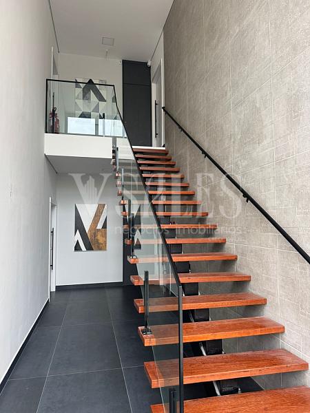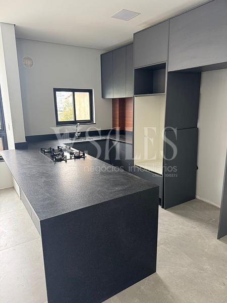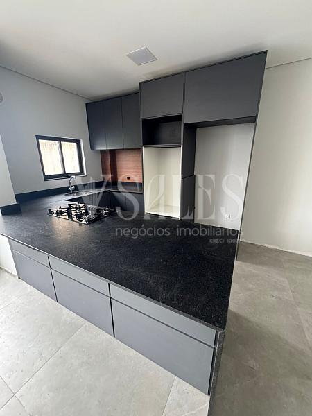 O andar inferior conta com 02 suítes, lavabo, e uma cozinha integrada à sala de estar, criando um ambiente moderno e acolhedor para receber amigos e familiares. A cozinha planejada com móveis sob medida traz funcionalidade e elegância, tornando o espaço ainda mais prático.