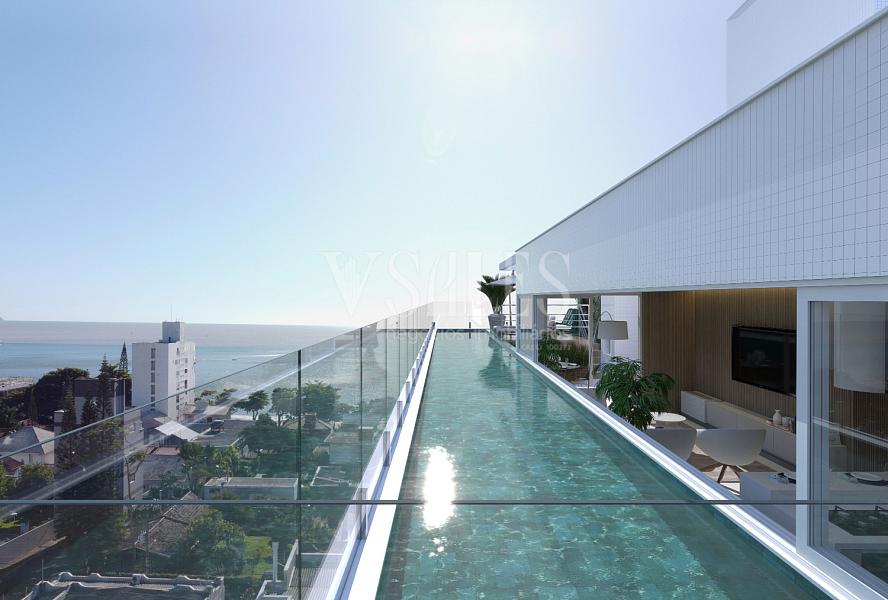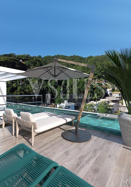 O rooftop panorâmico proporciona momentos inesquecíveis com piscina, deck e espaço gourmet, todos com uma vista privilegiada para o mar de Cabeçudas.