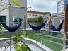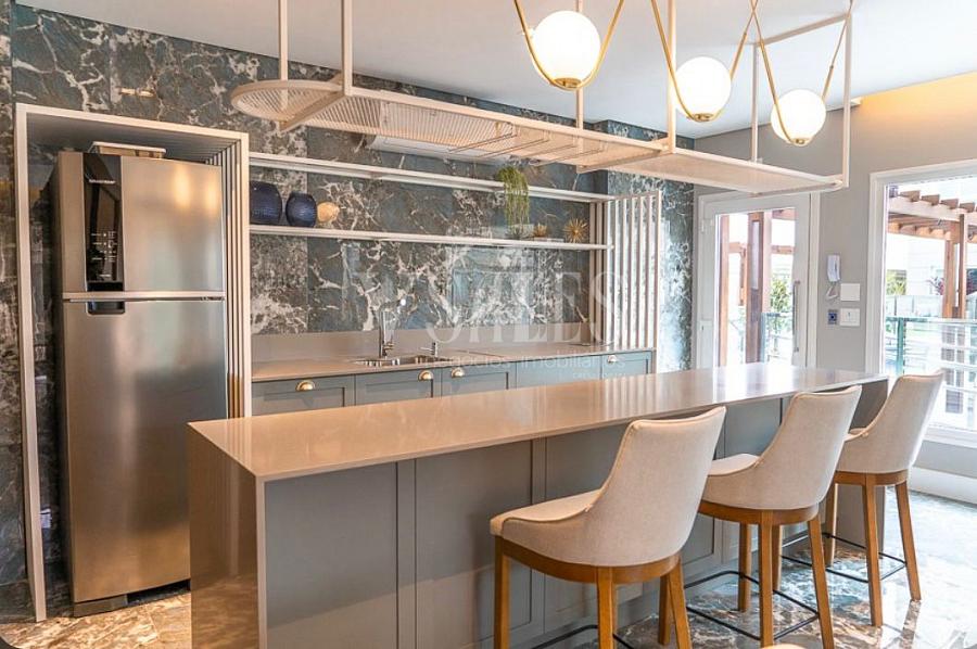 • Sacada com churrasqueira a carvão, pia de apoio, iluminação e ponto de gás