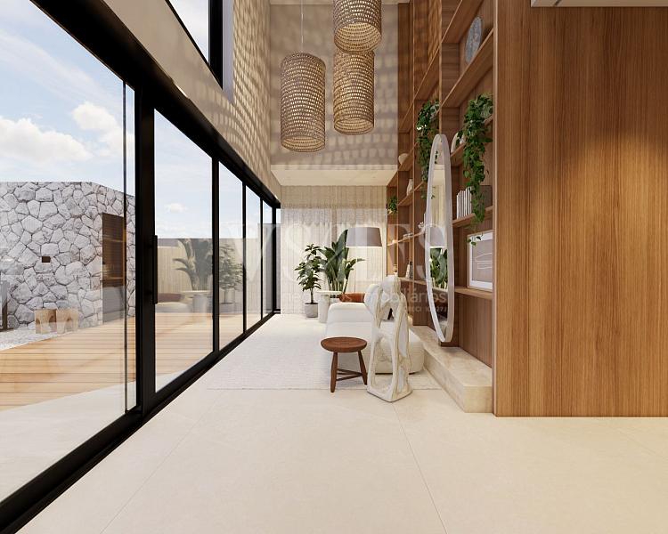Piso porcelanato nas áreas sociais e vinílico na área íntima